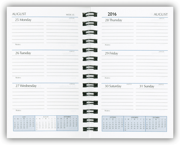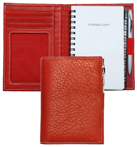 Made of top-grain leather. Elastic pen loop. Gun metal pen included. The left-side inside has three card slots, two pockets and an ID holder. There is an outside pocket on the back cover. A weekly calendar planner, a 13-division address book and a 40-sheet blank notepad are included.